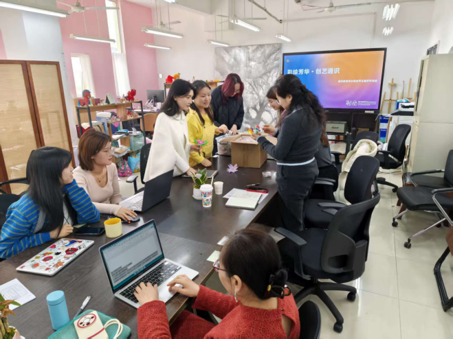 在实践环节,老师们化身“生活艺术家”,自由选择心仪的材料进行创作。水彩区,大家以笔绘心,用清透的色彩晕染出春日的诗意画卷;奶油胶区,精致的饰品盒与手机壳在巧手下诞生;串珠区,晶莹的珠玉被赋予了灵动的韵律,化作独一无二的手链与挂饰;扭扭棒区,一根根普通的绒棒经巧手扭折,变身为栩栩如生的花朵与萌趣小物。活动现场欢声笑语不断,大家时而专注创作,时而交流心得,在轻松惬意的氛围中感受手作的魅力与指尖的乐趣。